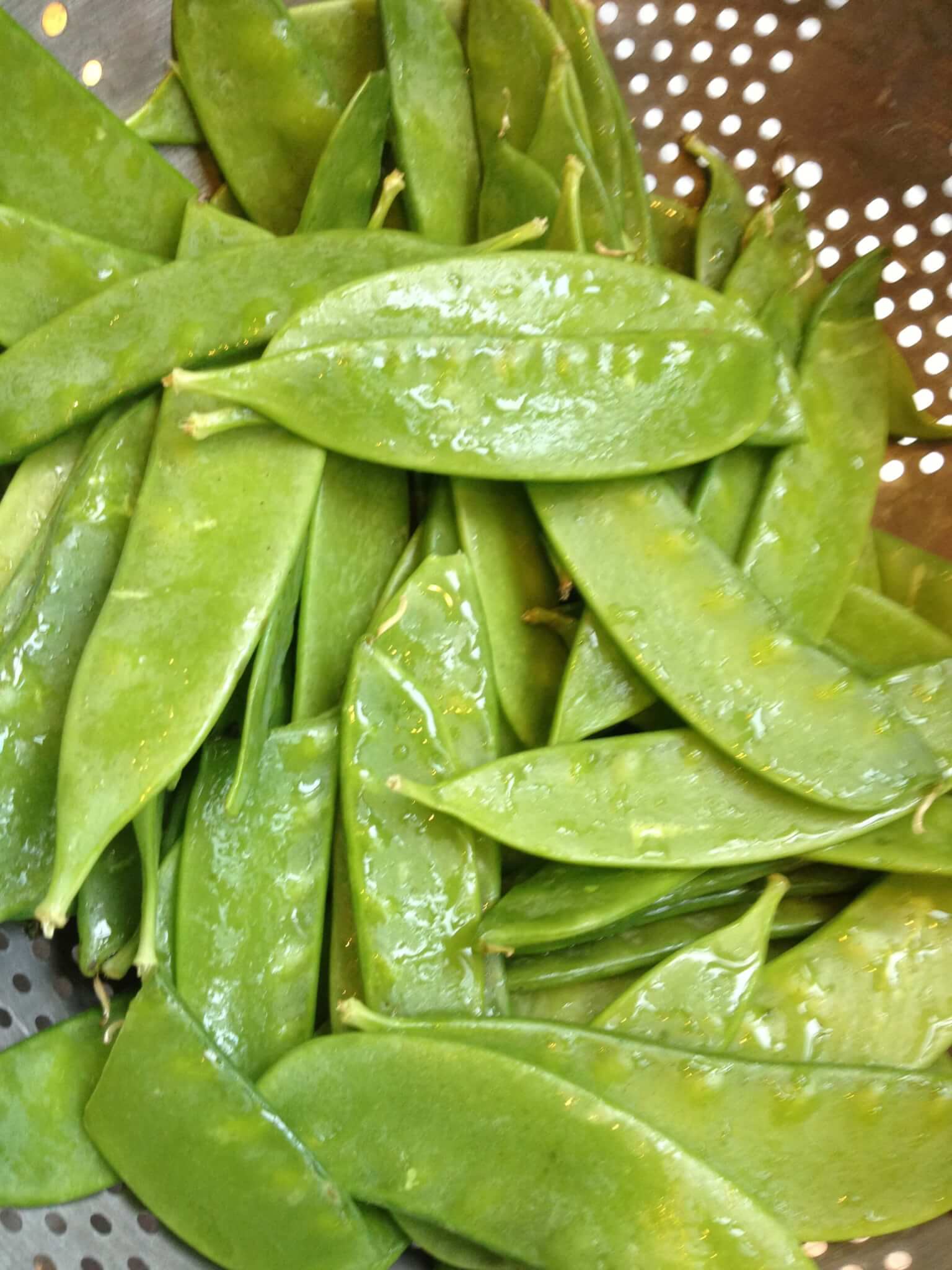 I love peas in the pod. I have a vivid memory of going to the supermarket with my mom and being allowed to fill a plastic vegetable bag to the brim with peas in the pod. Then, at home, my dad would sit on the couch, press the seam to open the pod, run his thumb down the inside to empty the peas into the palm of his hand and pop them in his mouth. We kids were quick studies and dug right in with him. Those peas didn’t last the day. I loved those peas and those times sitting together and using my dad’s quick pea-removal method. Nowadays, I rarely see a bin of loose peas in the pod; they are usually packaged in Styrofoam trays wrapped with plastic. Much less appetizing than the bin of fresh peas. So when I was in the produce section this week, I saw the snow peas, and even though they aren’t the same as the peas in the pod I ate with my dad, I couldn’t pass them up.