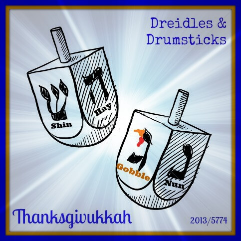 Once the meal has been eaten (and maybe before) we will spin the dreidel. The letters on the dreidel, Nun, Gimmel, Hay, and Shin, form the acronym Nes Gadol Hayah Sham; A Great Miracle Happened There (“there” meaning Israel). When the dreidel lands on Gimmel (the Miracle letter), the spinner wins the gelt (money) in the pot. This year, our letters will form the acronym Nes Gobble Hayah Sham, meaning A Great Thanksgivukkah Happened There (“there” meaning Connecticut). Only nine days left – I’ve got to get on that project! My grandfather used to make dreidels out of scrap wood blocks and nubby pencils. If he was here to celebrate with us, I bet he would make one for everyone.